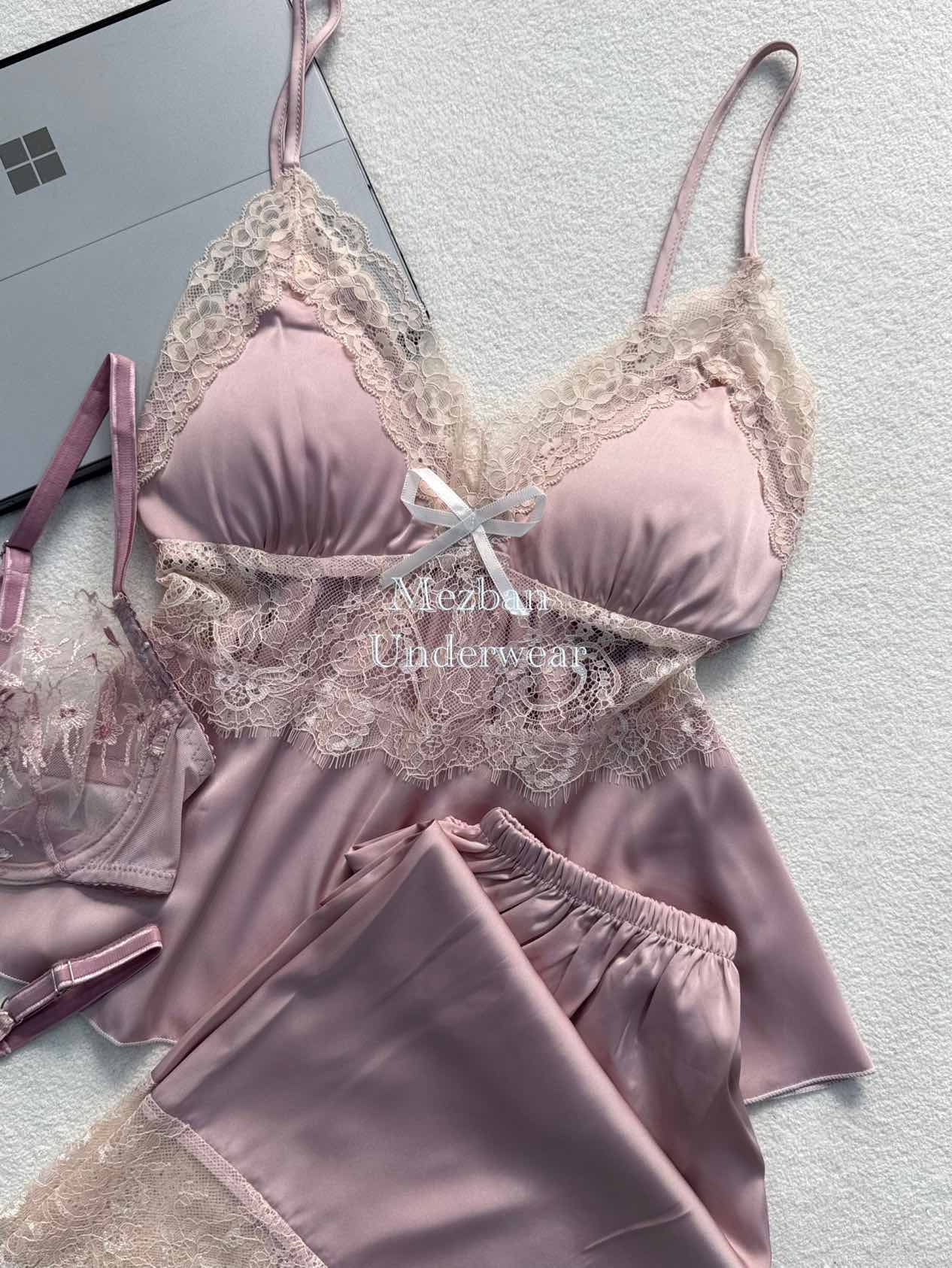ست چهارتکه ساتن و دانتل صورتی